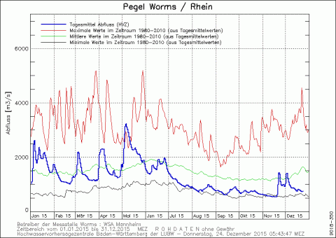 De waterstand in de Rijn bedraagt bij Lobith nu ca 8,5 m en is voor de tijd van het jaar dan ook zeer laag; meer dan 2 m onder de normale stand voor deze tijd van het jaar. Als we naar de afvoer in de Rijn kijken (1500 m3/s bij Lobith) dan valt de lage waarde nog wel mee. Deze afvoer komt eind december zo eens in de 4 tot 5 jaar voor. De lage standen zijn dan ook niet een gevaolg van weinig water, maar vooral een gevolg van de bodemdaling van de rivier (met ca 2 cm/jr). Zo lijkt het of de rivier steeds minder water transporteert, maar dat is dus niet het geval.